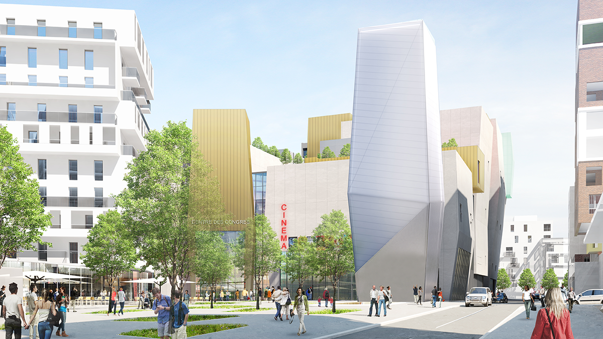 SURFACES: free housing: 37,100 sq.m., social housing:10,250 sq.m., cinema: 7,500 sq.m., hotel: 6,760 sq.m., convention center: 6,000 sq.m., retail: 4,400 sq.m., supermarket: 2,500 sq.m., nursery school: 2,200 sq.m.