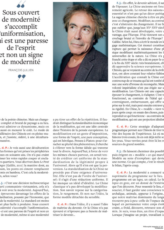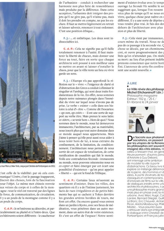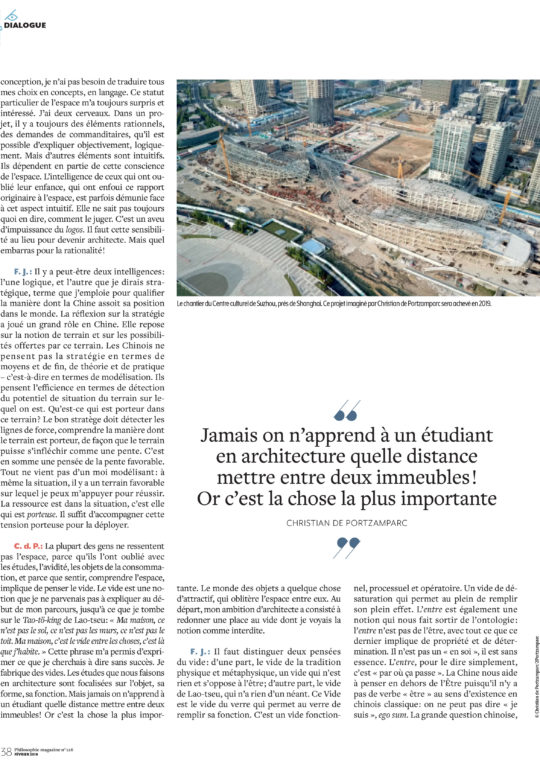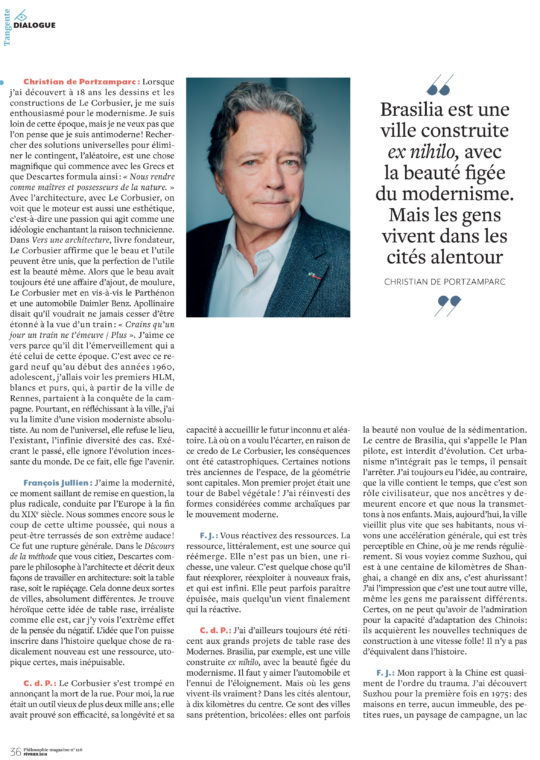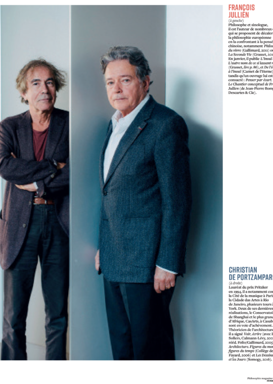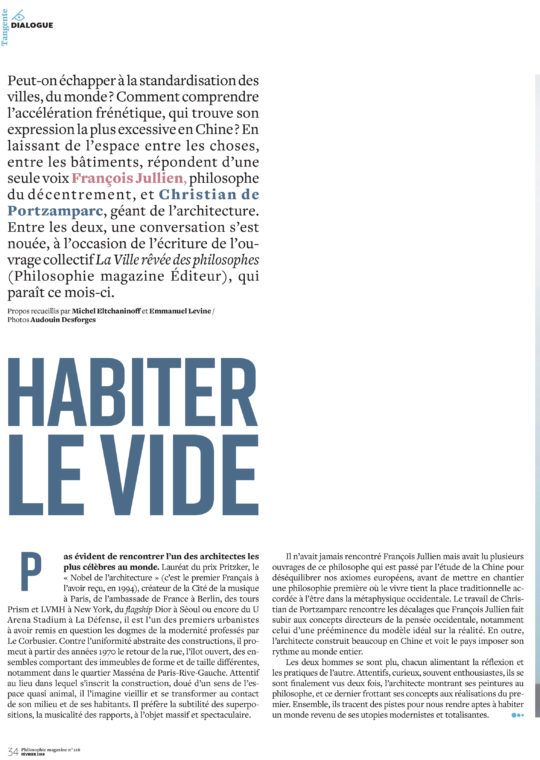 Peut-on échapper à la standardisation des villes, du monde ? Comment comprendre l’accélération frénétique, qui trouve son expression la plus excessive en Chine ? En laissant de l’espace entre les choses, entre les bâtiments, répondent d’une seule voix François Jullien, philosophe du décentrement, et Christian de Portzamparc, géant de l’architecture. Entre les deux, une conversation s’est nouée, à l’occasion de l’écriture de l’ouvrage collectif La Ville rêvée des philosophes (Philosophie magazine Éditeur), qui paraît ce mois-ci.