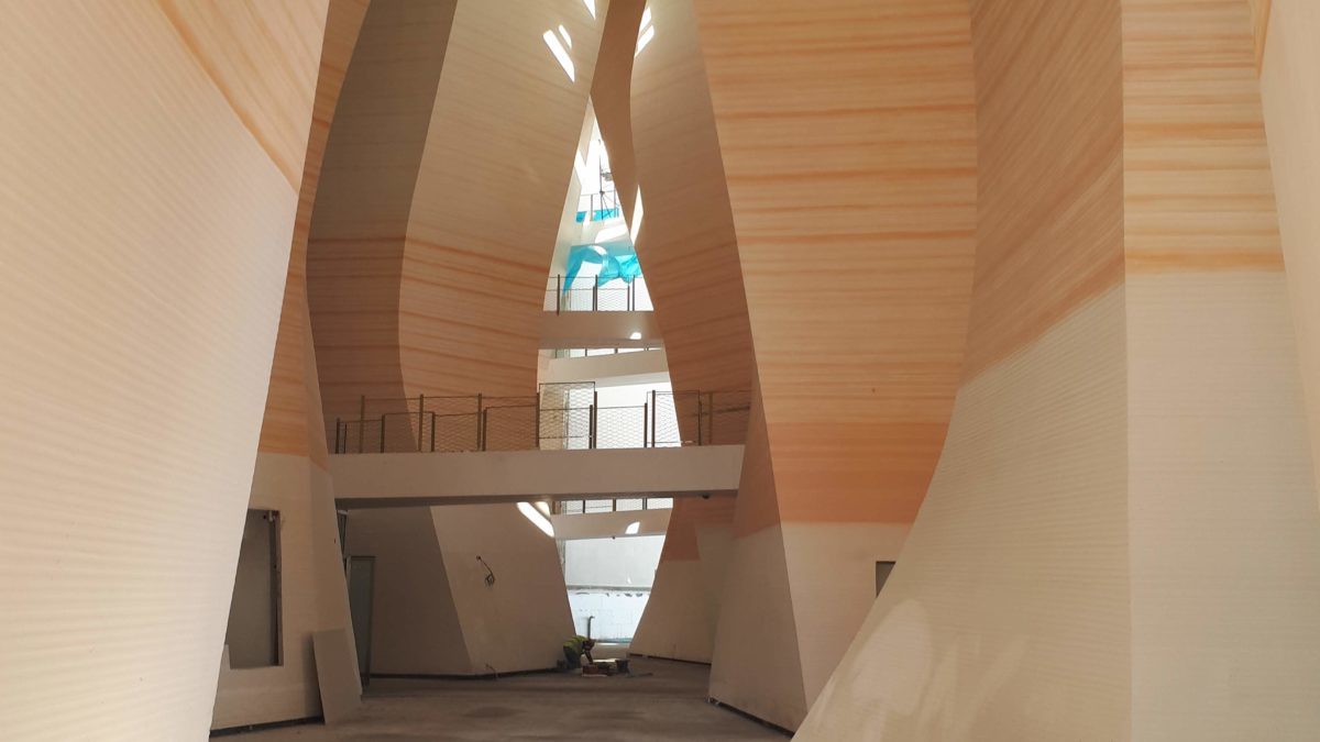 Au lieu d’un objet architectural autonome, univoque, cet ensemble fluide se joue de la symétrie sans s’y opposer, et invite à pénétrer dans l’ombre d’un autre univers intérieur, en ouvrant plusieurs failles et entrées, fines, attirantes, vers une grande et haute galerie publique traversante formée de piliers incurvés de staff rouge. Dans la simplicité extérieure de l’architecture blanche, les failles attirent le passant vers l’ombre, le clair-obscur de ce parcours et de ce lieu d’entrée, passage où l’on vient s’assoir dans les cafés installés ici car l’air y est rafraîchi par la ventilation naturelle. Sur les bâtiments de la place se déploie un voile de moucharabié de terre cuite et résine.