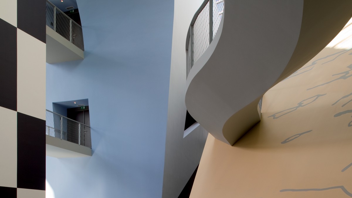 Ce monde intérieur est l’espace d’accueil dessiné en volumes simples et qui apparaît au travers de grandes baies vitrées. On pense, peut-être, aux cases de la bande dessinée. Une tour ascenseur monte dans les étages des quatre volumes opaques du musée qui possèdent leur propre personnalité et couleur et où s’installent les salles consacrées à l’artiste et mis en scène par Joost Swarte.